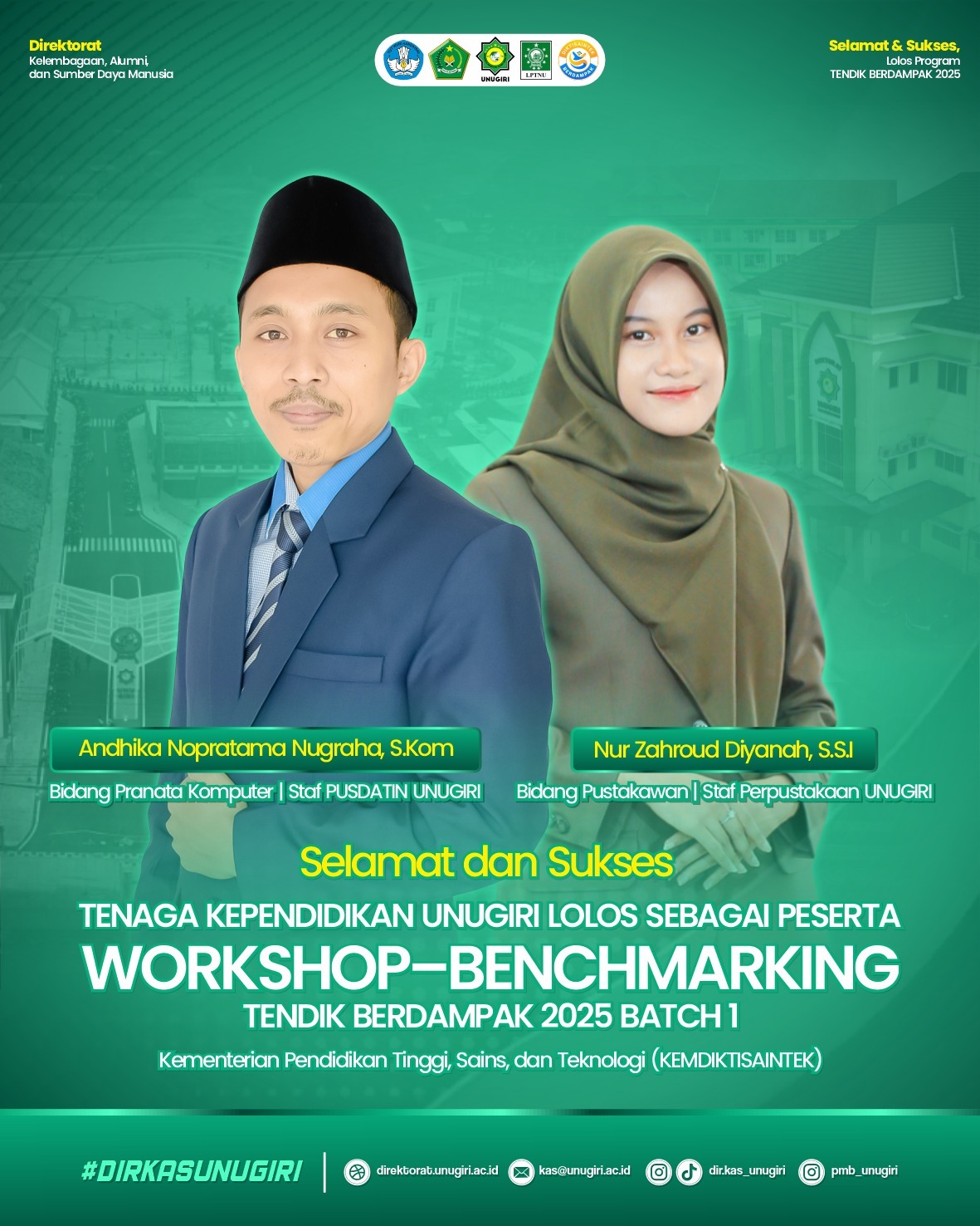 unugiri.ac.id Bojonegoro – Dua tenaga kependidikan Universitas Nahdlatul Ulama Sunan Giri (UNUGIRI) Bojonegoro dinyatakan lolos sebagai peserta Workshop–Benchmarking Program Tendik Berdampak 2025 Batch 1. Program ini merupakan bagian dari upaya Kementerian Pendidikan Tinggi, Sains, dan Teknologi (Kemdiktisaintek) dalam meningkatkan kualitas sumber daya manusia di perguruan tinggi melalui penguatan kompetensi teknis dan manajerial tenaga kependidikan (tendik)....Read More