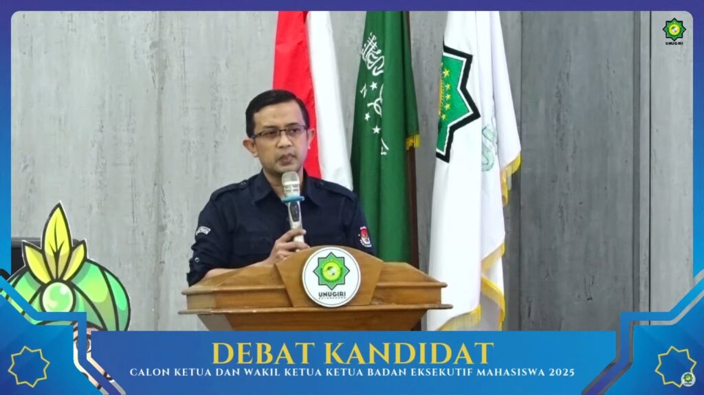 unugiri.ac.id Bojonegoro – Pemilihan Raya Mahasiswa (PEMIRA) Universitas Nahdlatul Ulama Sunan Giri (UNUGIRI) Bojonegoro resmi memasuki tahap penting dengan diselenggarakannya Debat Kandidat Calon Ketua dan Wakil Ketua Badan Eksekutif Mahasiswa (BEM) periode 2025/2026. Acara ini berlangsung pada Selasa, 21 Oktober 2025 di Auditorium KH. Hasyim Asy’ari, Gedung Rektorat Lantai 3, dan dihadiri oleh Ketua KPU Kabupaten Bojonegoro Robby Adi Perwira, Wakil Rektor Bidang Akademik Kemahasiswaan dan Keagamaan Dr. Nurul Huda, M.H.I., Direktur Akademik Kemahasiswaan dan Keagamaan Ainu Zuhriyah, S.Kep., Ns., M.Pd., Dekan Kaprodi, mahasiswa dari berbagai fakultas.