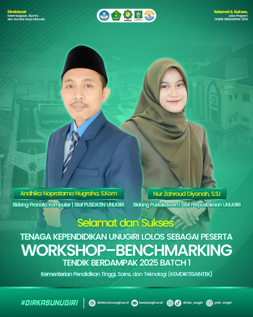 Dua tendik UNUGIRI yang lolos seleksi tersebut adalah Andhika Nopratama Nugraha, S.Kom, staf Pusat Data dan Informasi (PUSDATIN) UNUGIRI di bidang Pranata Komputer, serta Nur Zahroud Diyanah, S.S.I, staf Perpustakaan UNUGIRI di bidang Pustakawan. Keduanya berhasil bersaing bersama ribuan pendaftar dari berbagai perguruan tinggi di Indonesia.